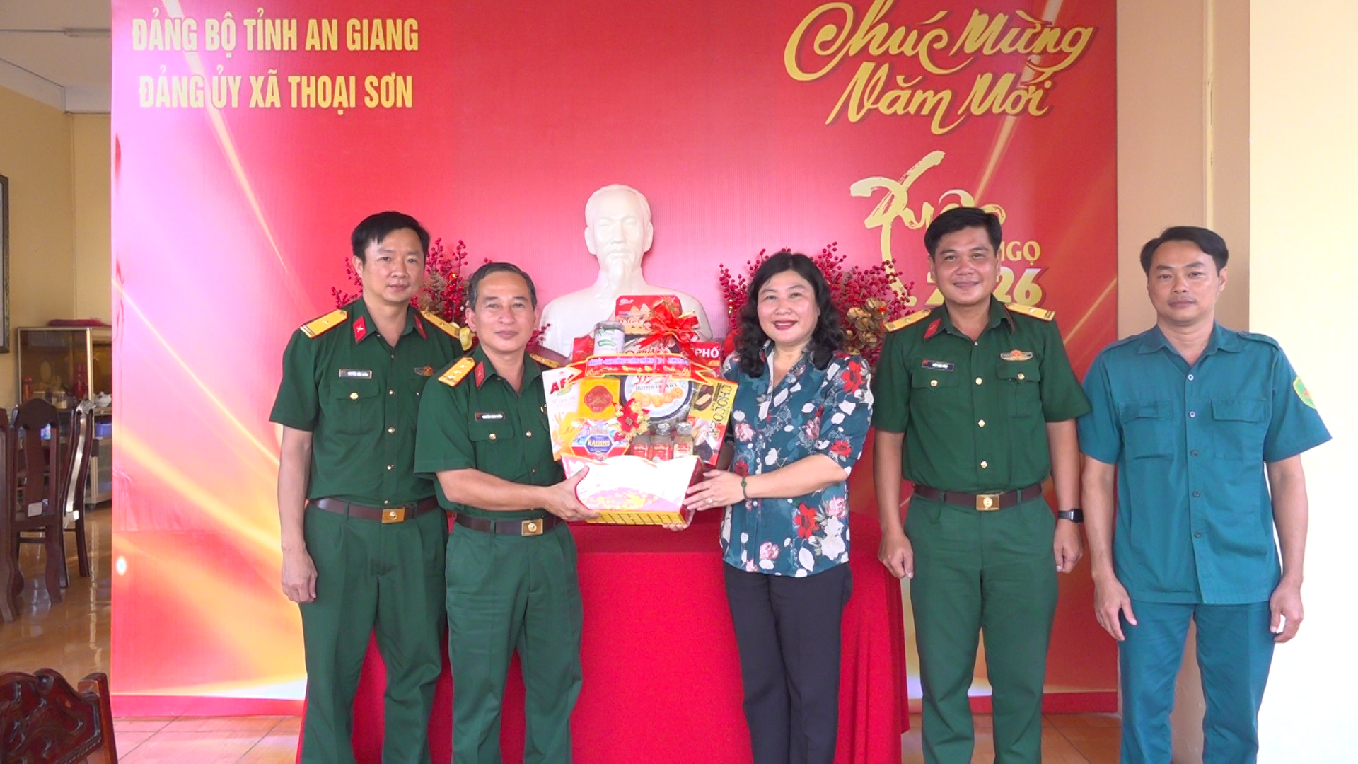 Nhân dịp Tết Nguyên đán Bính Ngọ năm 2026 đang đến gần, Bộ Chỉ huy Quân sự tỉnh An Giang đã tổ chức đoàn công tác đến thăm, chúc Tết Đảng ủy xã và Ban Chỉ huy Quân sự xã Thoại Sơn. Đoàn công tác do Thượng tá Nguyễn Minh Châu – Phó Chỉ huy trưởng Ban Chỉ huy Phòng thủ khu vực 2 Long Xuyên, Bộ Chỉ huy Quân sự tỉnh An Giang làm trưởng đoàn. Tiếp và làm việc với đoàn có đồng chí Lê Bích Phượng – Tỉnh ủy viên, Bí thư Đảng ủy, Chủ tịch Hội đồng Nhân dân xã Thoại Sơn, cùng lãnh đạo Ban Chỉ huy Quân sự xã.