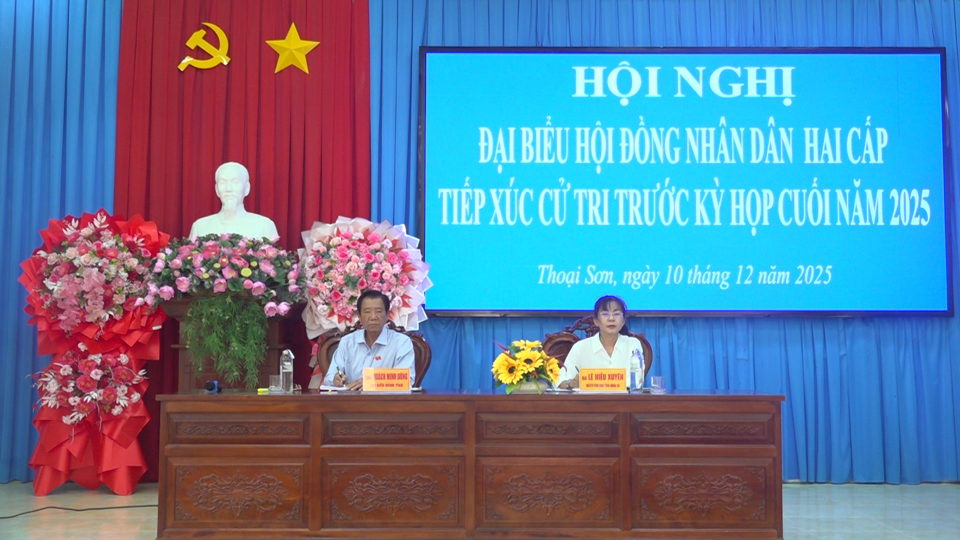 Sáng ngày 10/12/2025, tại Hội trường UBND xã Thoại Sơn, Đoàn đại biểu HĐND tỉnh An Giang và HĐND xã Thoại Sơn đã tổ chức Hội nghị tiếp xúc cử tri trước kỳ họp cuối năm 2025. Đại biểu tham dự hội nghị gồm: ông Quách Minh Dũng – Đại biểu HĐND tỉnh An Giang; ông Dương Minh Hùng – Phó Bí thư Thường trực Đảng ủy xã Thoại Sơn; ông Nguyễn Ngọc Điệp – Phó Bí thư Đảng ủy, Chủ tịch UBND xã Thoại Sơn; bà Lê Hiếu Xuyên – Phó Chủ tịch HĐND xã; cùng đại diện các ban ngành, đoàn thể xã và hơn 100 cử tri đại diện các ấp trên địa bàn tham dự.