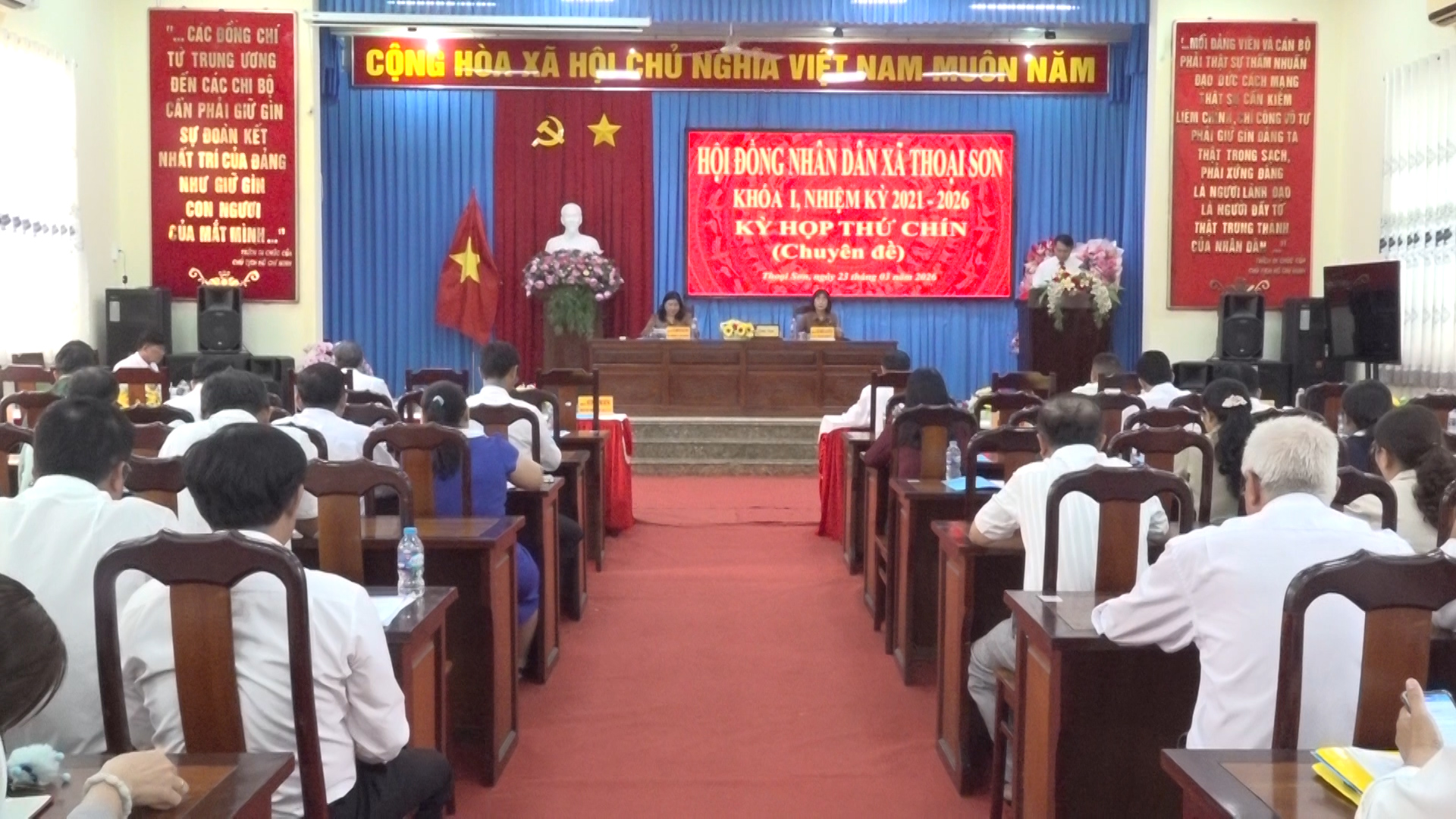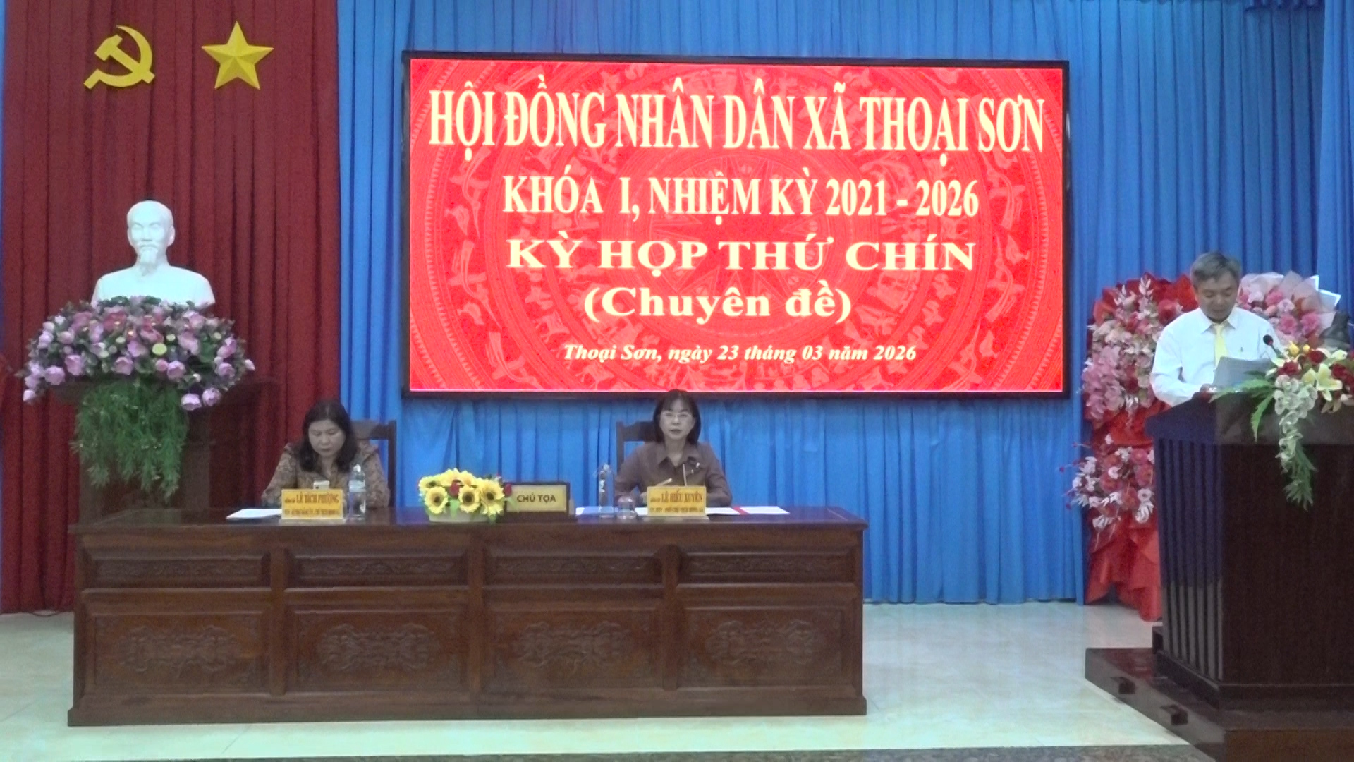 Ngày 23/3/2026, Hội đồng nhân dân xã Thoại Sơn (tỉnh An Giang) khóa I, nhiệm kỳ 2021 – 2026 tổ chức kỳ họp thứ chín (kỳ họp chuyên đề) nhằm xem xét, quyết định một số nội dung quan trọng thuộc thẩm quyền. Kỳ họp do bà Lê Bích Phượng – Tỉnh ủy viên, Bí thư Đảng ủy, Chủ tịch HĐND xã Thoại Sơn và bà Lê Hiếu Xuyên – Phó Chủ tịch HĐND xã đồng chủ trì. Tham dự kỳ họp có các đại biểu HĐND xã cùng đại diện các ban, ngành liên quan.
