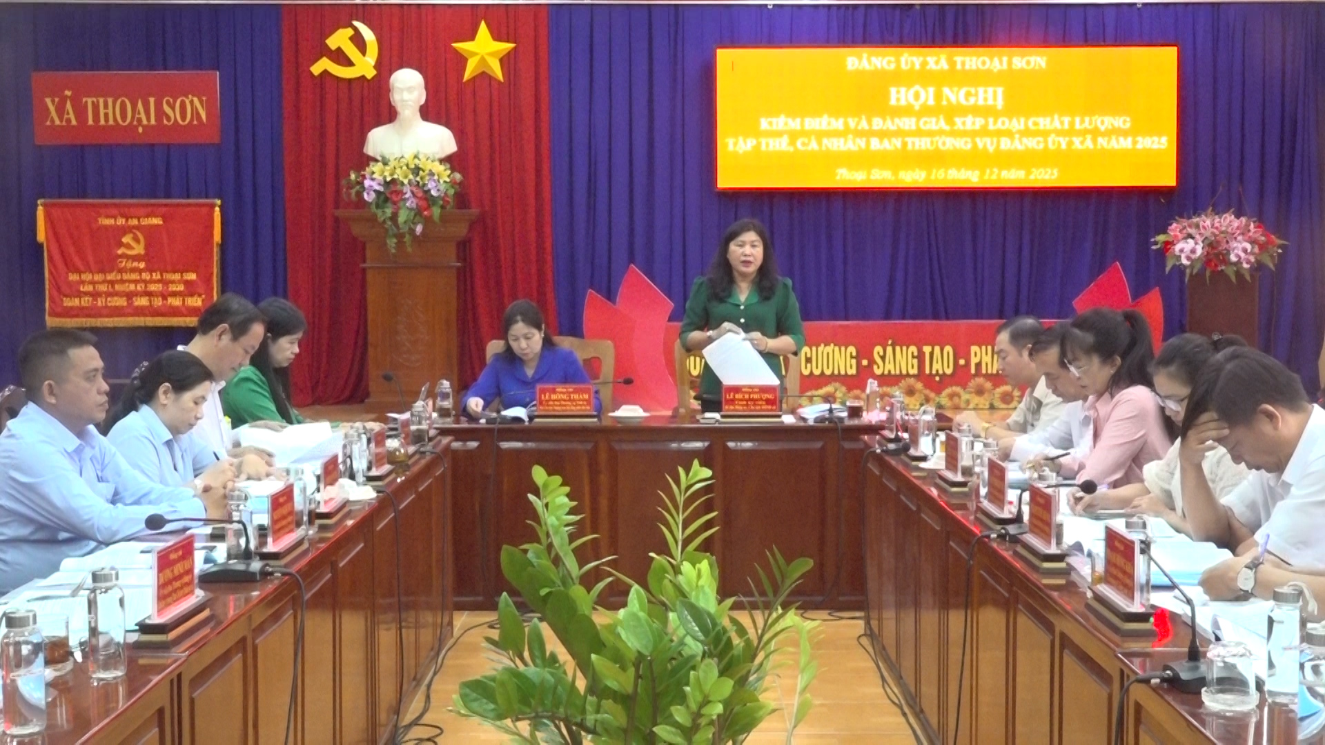 Ngày 16/12/2025. Đảng ủy xã Thoại Sơn tổ chức hội nghị kiểm điểm và tự đánh giá, xếp loại tập thể, cá nhân ủy viên Ban thường vụ Đảng ủy năm 2025. Tham dự có đồng chí Lê Hồng Thắm, Ủy viên Ban thường vụ Tỉnh ủy, Phó Chủ tịch HĐND tỉnh An Giang cùng đại diện lãnh đạo UBKT tỉnh ủy, văn phòng đoàn Đại biểu quốc hội và HĐND tỉnh An Giang; đồng chí Lê Bích Phượng – Tỉnh ủy viên, Bí thư Đảng ủy, Chủ tịch HDND xã chủ trì; cùng các đồng chí Phó bí thư Đảng ủy, các đồng chí ủy viên Ban thường vụ Đảng ủy.