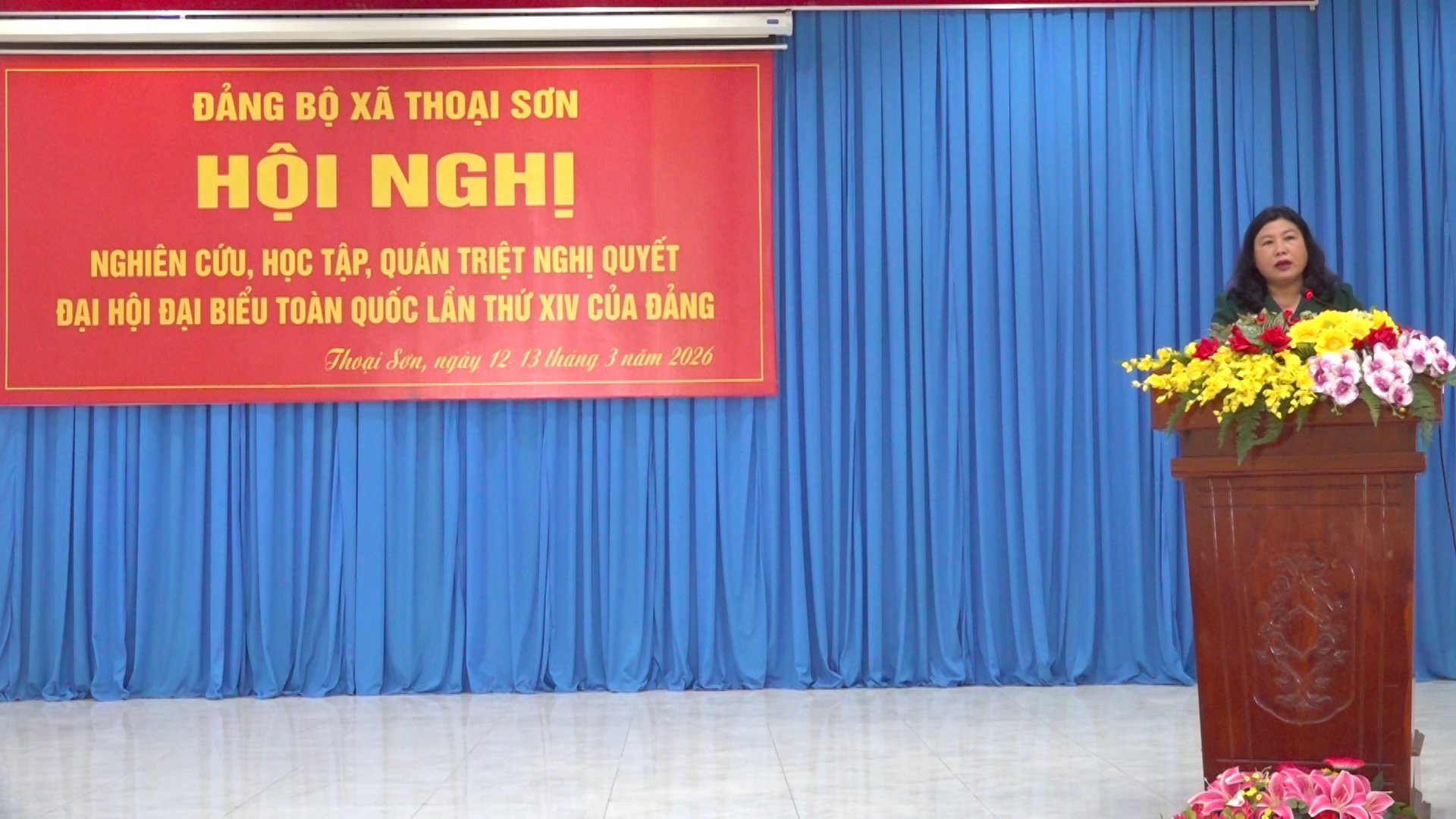 Trong các ngày 12 và 13/3/2026, Ban Thường vụ Đảng ủy xã Thoại Sơn tổ chức Hội nghị nghiên cứu, học tập, quán triệt, tuyên truyền và triển khai thực hiện Nghị quyết Đại hội đại biểu toàn quốc lần thứ XIV của Đảng Cộng sản Việt Nam và Nghị quyết Đại hội Đảng bộ tỉnh An Giang lần thứ I, nhiệm kỳ 2025 – 2030. Với sự tham dự của Thường trực Đảng ủy, các đồng chí Ủy viên Ban Chấp hành Đảng bộ xã, lãnh đạo các cơ quan, đơn vị, báo cáo viên cấp xã cùng cán bộ, đảng viên trong Đảng bộ xã.
