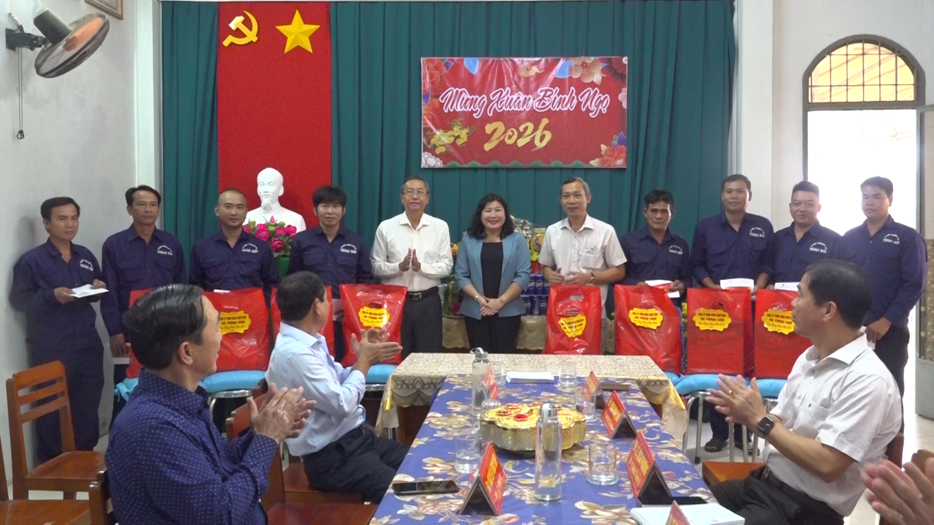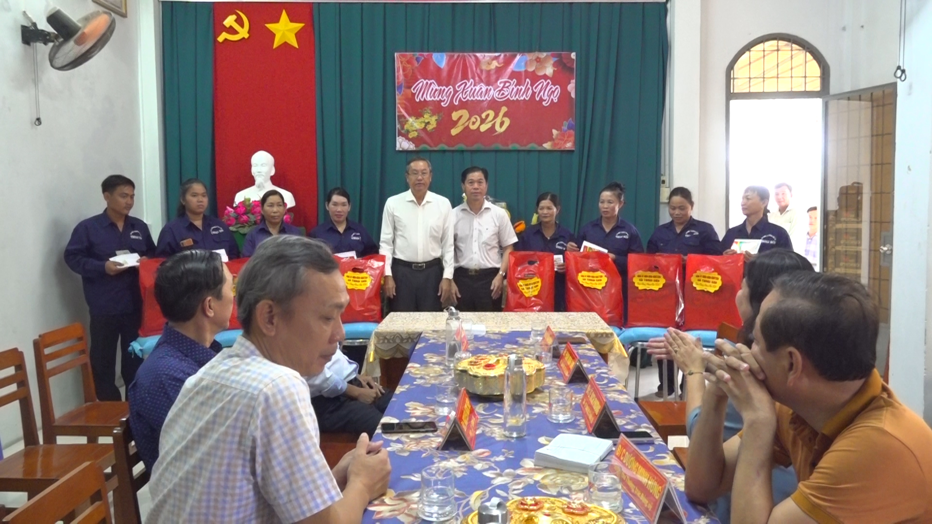 Các anh chị công nhân xí nghiệp môi trường đô thị nhận quà từ lãnh đạo tỉnh và xã, đón xuân Bính Ngọ 2026