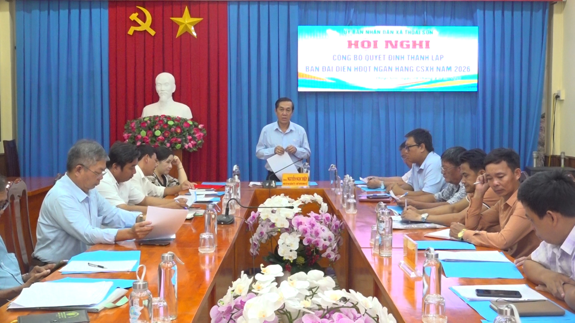Ngày 09/4/2026, Ủy ban nhân dân xã Thoại Sơn tổ chức lễ công bố quyết định và ra mắt Ban đại diện Hội đồng quản trị Ngân hàng Chính sách xã hội xã Thoại Sơn. Tham dự có đồng chí Nguyễn Ngọc Điệp - Phó Bí thư Đảng ủy, Chủ tịch UBND xã; ông Nguyễn Phước Điền – Giám đốc Phòng giao dịch Ngân hàng Chính sách xã hội Thoại Sơn; cùng đại diện các phòng ban chuyên môn.