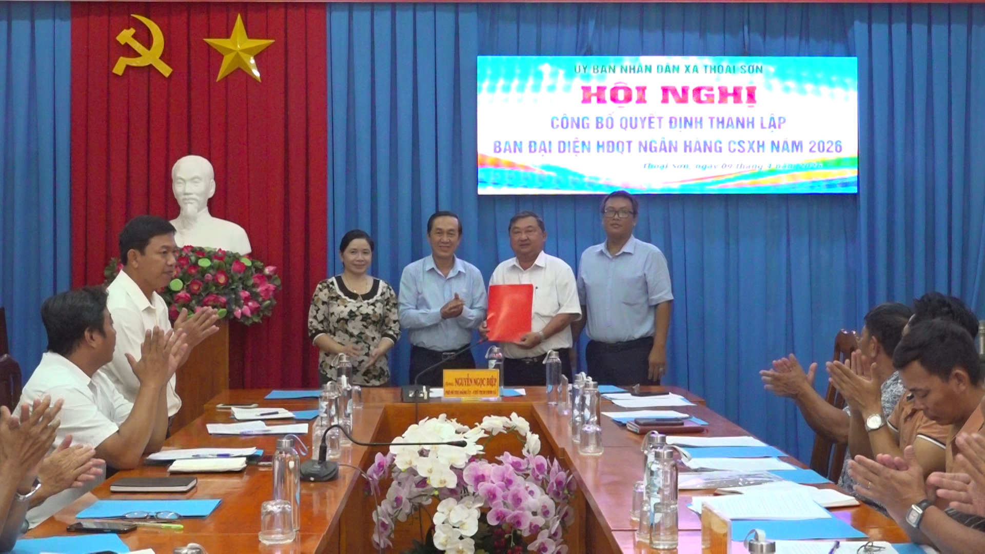 Cũng tại buổi lễ, đại diện Ngân hàng Chính sách xã hội Thoại Sơn đã công bố quyết định thành lập Ban đại diện Hội đồng quản trị Ngân hàng Chính sách xã hội xã, gồm 4 thành viên. Đồng chí Nguyễn Ngọc Điệp – Phó Bí thư Đảng ủy, Chủ tịch UBND xã được phân công giữ chức Trưởng Ban, các thành viên gồm bà Nguyễn Thị Mỹ Xuyên, Chủ tịch UBMTTQ Việt Nam xã Thoại Sơn; ông Nguyễn Tháp Giang – Trưởng phòng Văn hóa – xã hội; ông Nguyễn Phước Điền - Giám đốc Phòng giao dịch Ngân hàng Chính sách xã hội Thoại Sơn.