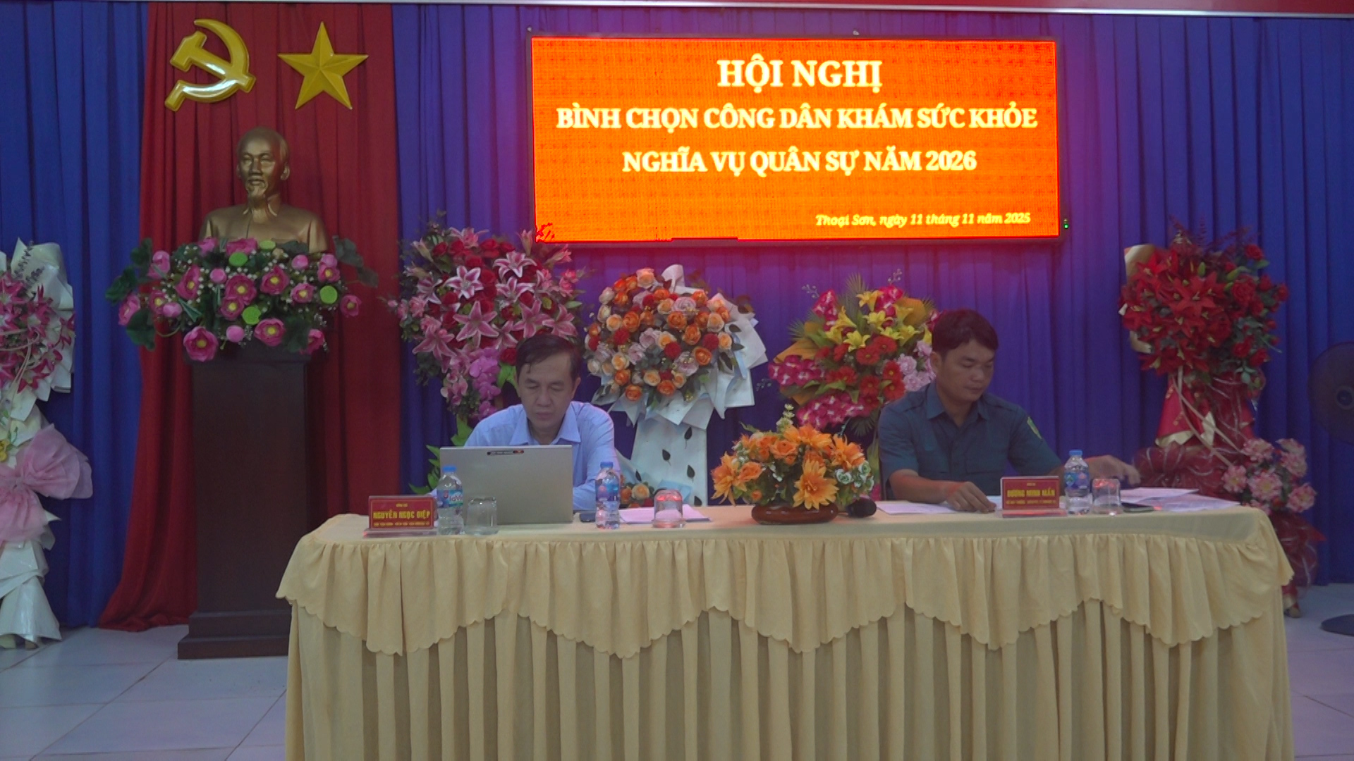 Ngày 11 tháng 11 năm 2025, Hội đồng Nghĩa vụ quân sự xã Thoại Sơn tổ chức Hội nghị bình chọn công dân khám sức khỏe nghĩa vụ quân sự năm 2026, nhằm đánh giá, rà soát và lập danh sách những công dân đủ điều kiện tham gia khám tuyển, bảo đảm đúng quy trình, công khai, dân chủ và theo quy định của pháp luật. Tham dự có đồng chí Nguyễn Ngọc Điệp – Phó Bí thư Đảng ủy, Chủ tịch UBND xã, Chủ tịch Hội đồng nghĩa vụ quân sự xã Thoại Sơn.